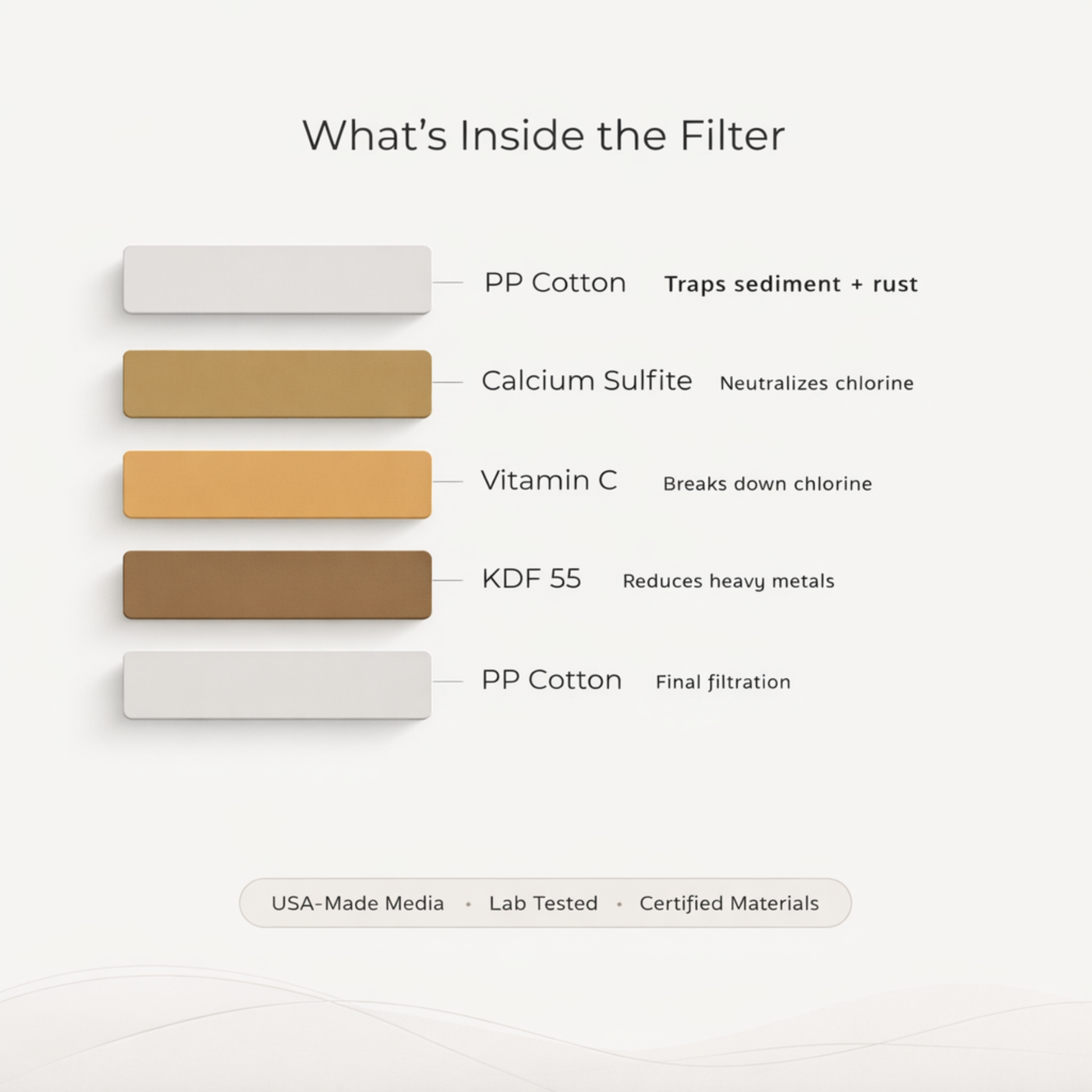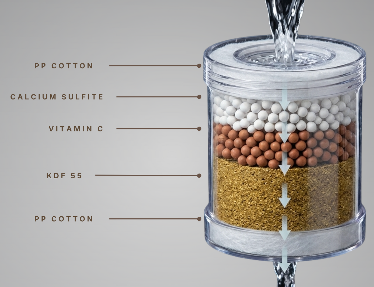 Every drop passes through 5 layers — PP Cotton, Calcium Sulfite, Vitamin C, KDF 55 — neutralizing chlorine and trapping heavy metals before they touch your skin.