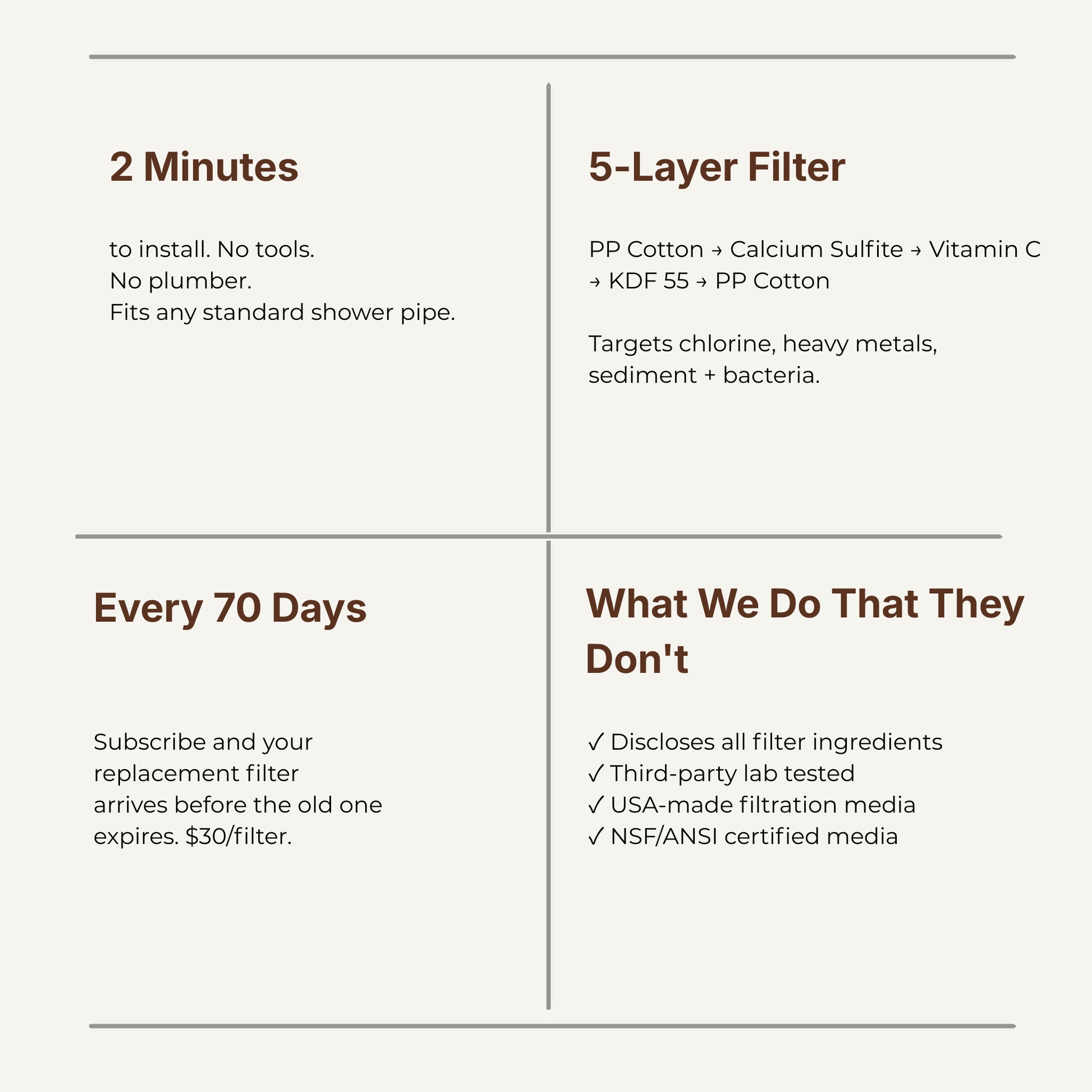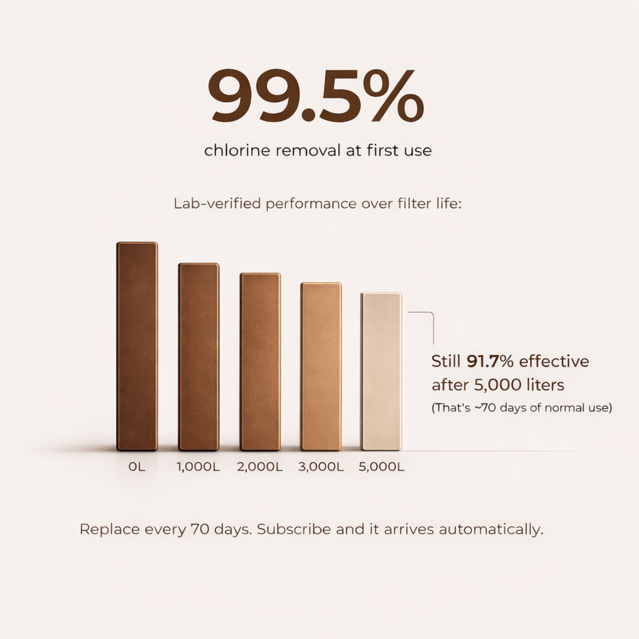 Your replacement filter ships automatically every 70 days. Swap it in 30 seconds. Never shower in dirty water again.